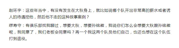 “这些年当中,有没有发生在大秋身上,就比如说哪个队开出非常高的薪水或者诱人的待遇挖他,然后他不走的这种故事案例?”媒体人赵环宇问。
